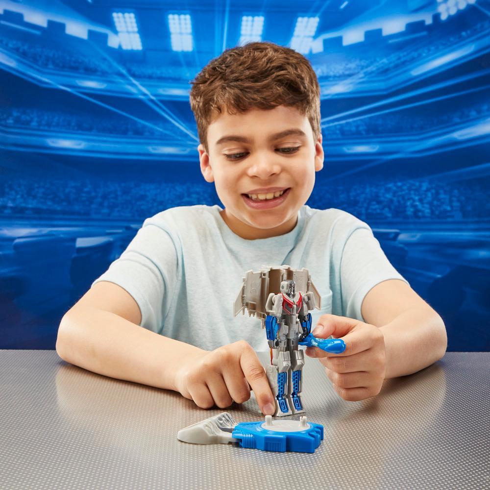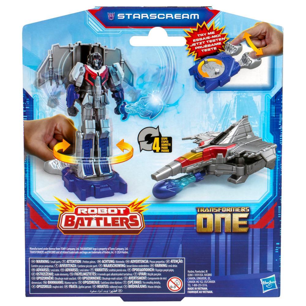 Experience the epic origins of legendary Transformers robots with these Transformers One Battling Robots action figures! This 4.5-inch (11.5 cm) Starscream figure converts from robot to Cybertronian jet mode in 4 steps, with simple conversion perfect for Transformers fans age 6 and up. Place the action figure on the Battle Base and slide the finger slots for cool action moves! The figure has articulated head, arms, and legs for awesome action poses. Includes a Battle Base and a sword that attaches in robot mode. This Robot Battlers action figure is inspired by an iconic character from the Transformers movie, Transformers One. Movie-inspired Interactive toys make cool gifts for boys and girls ages 6 and up. Transformers One is the untold origin story of Optimus Prime and Megatron, once friends bonded like brothers, who changed the fate of Cybertron forever.