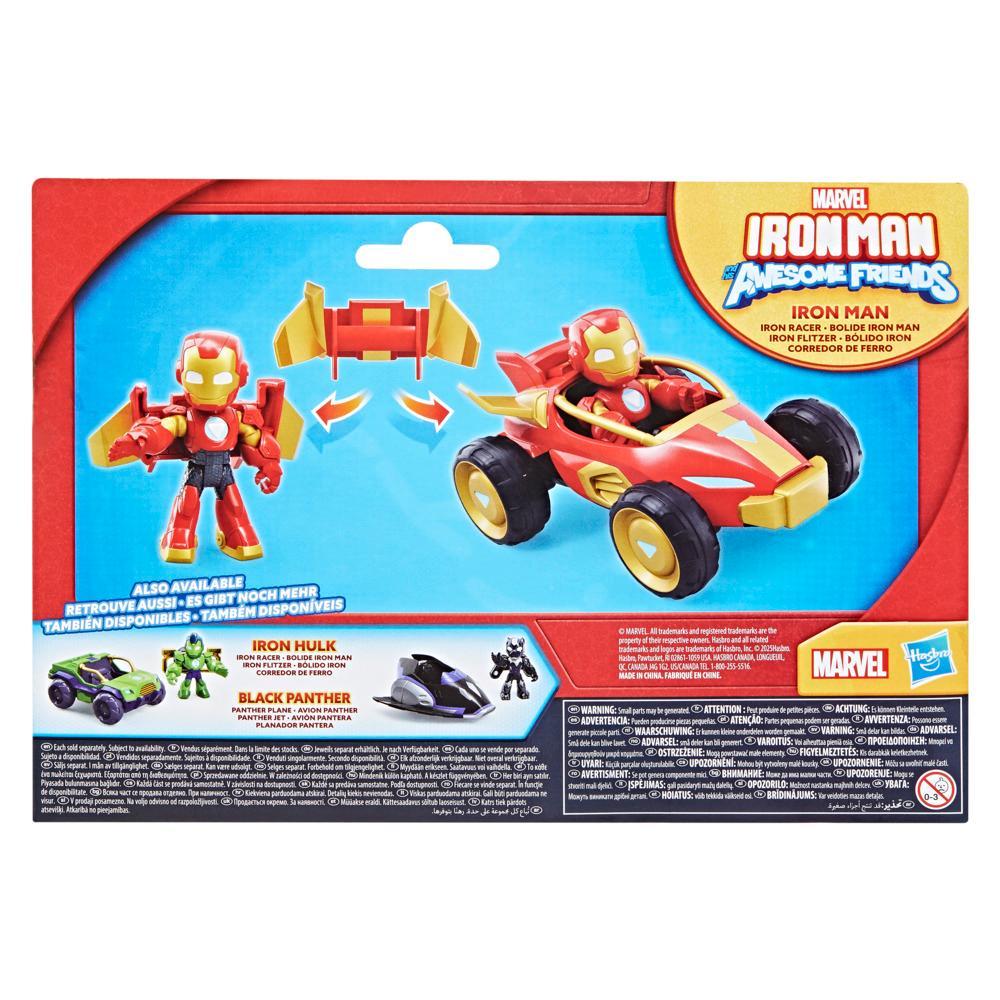 Join Team Iron Man on the latest adventures with this Iron Man Iron Racer figure & car 2-pack! This 3-inch (7.6 cm) vehicle toy comes with a poseable Iron Man that fits inside. Imagine speeding into action to save the day or remove the detachable 2-in-1 spoiler accessory from the vehicle, attach it to the figure??s back to armor up, and pretend to soar into adventure. Encourage big, imaginative, adventure play for kids ages 3 & up with these Marvel toys for boys and girls! Look for even more Iron Man and His Awesome Friends toys, including Iron Hulk with Iron Racer race car toy and Black Panther with Panther Plane airplane toy, as well as playsets and accessories, to build a Super Hero collection or give as cool Marvel gifts for preschool kids! (Each sold separately. Subject to availability.)